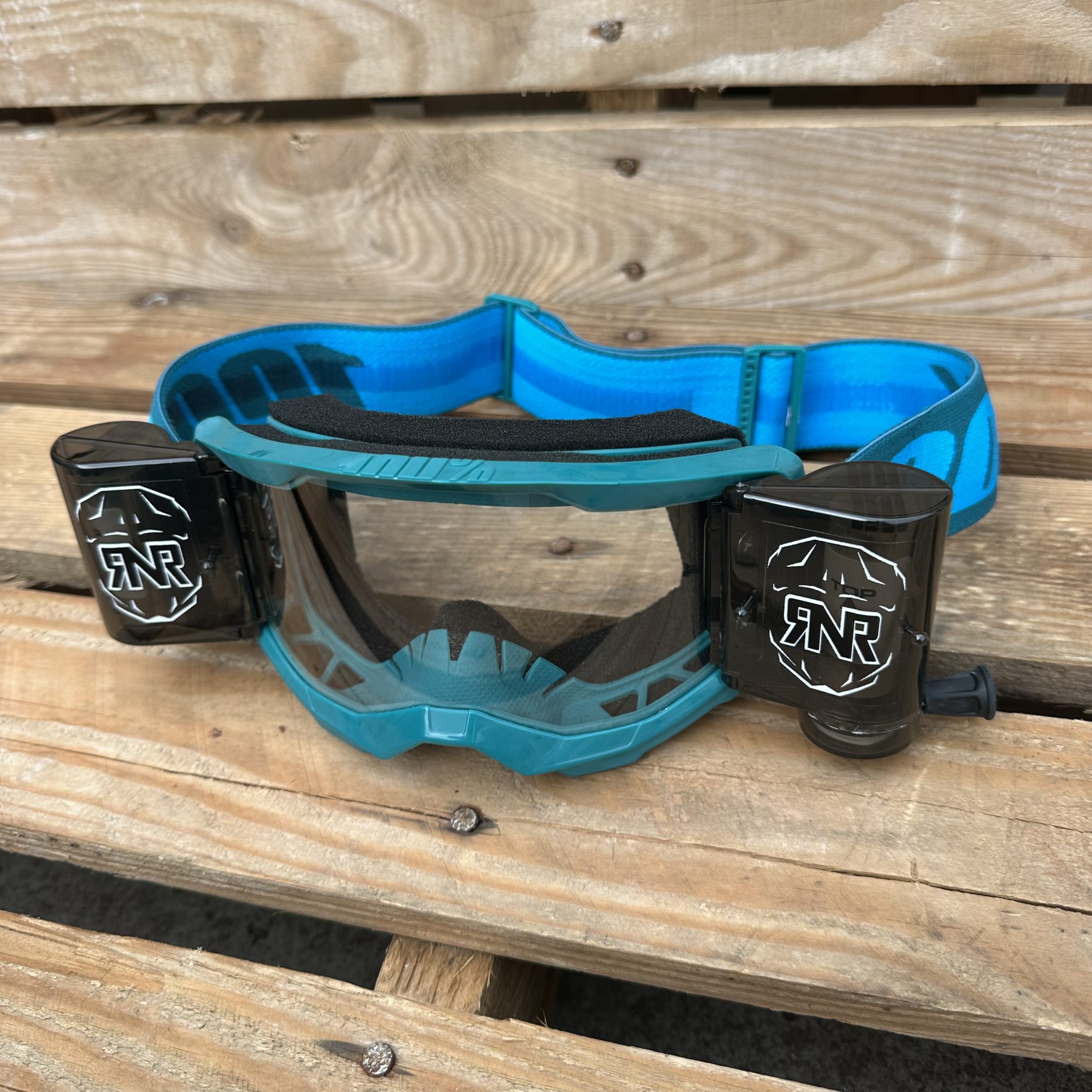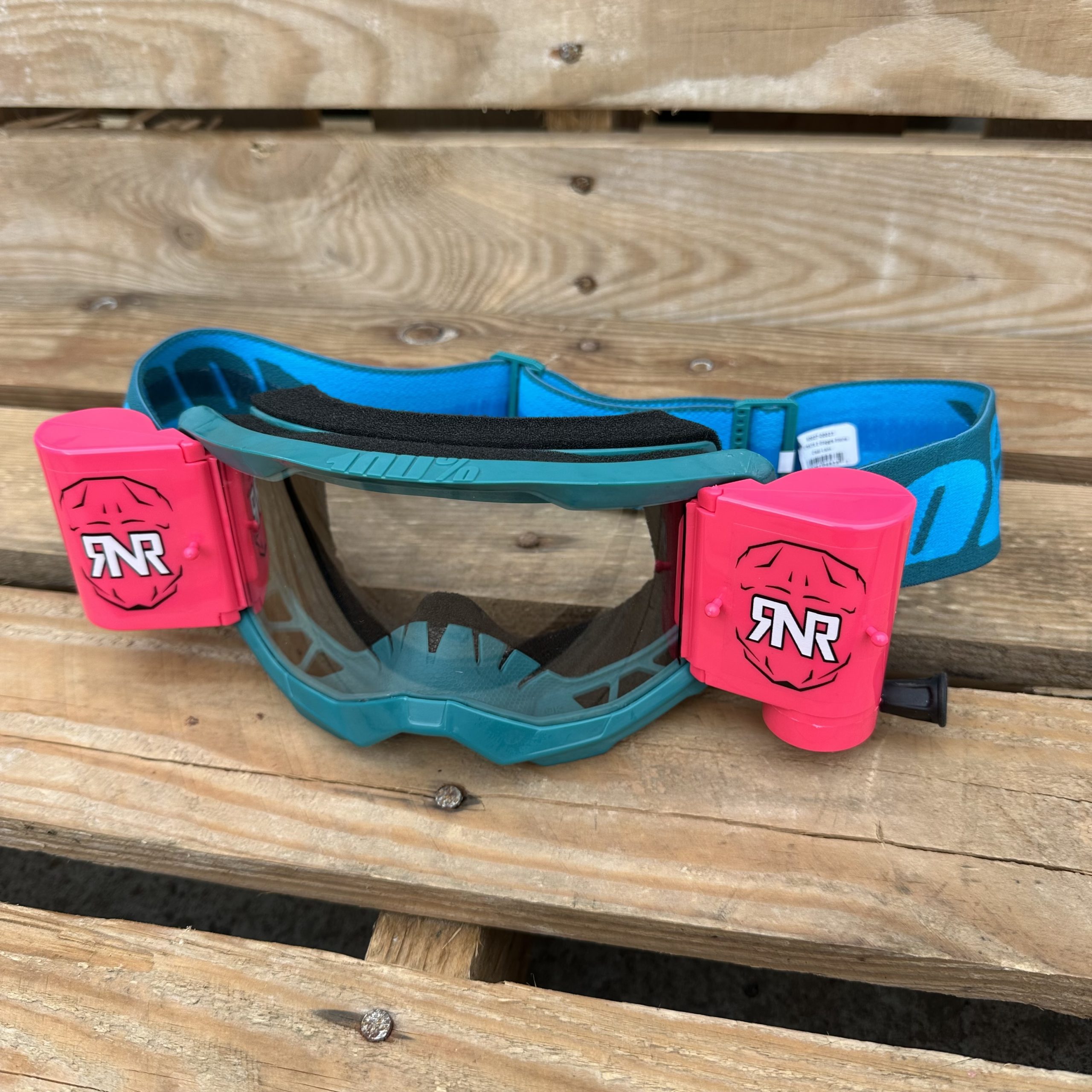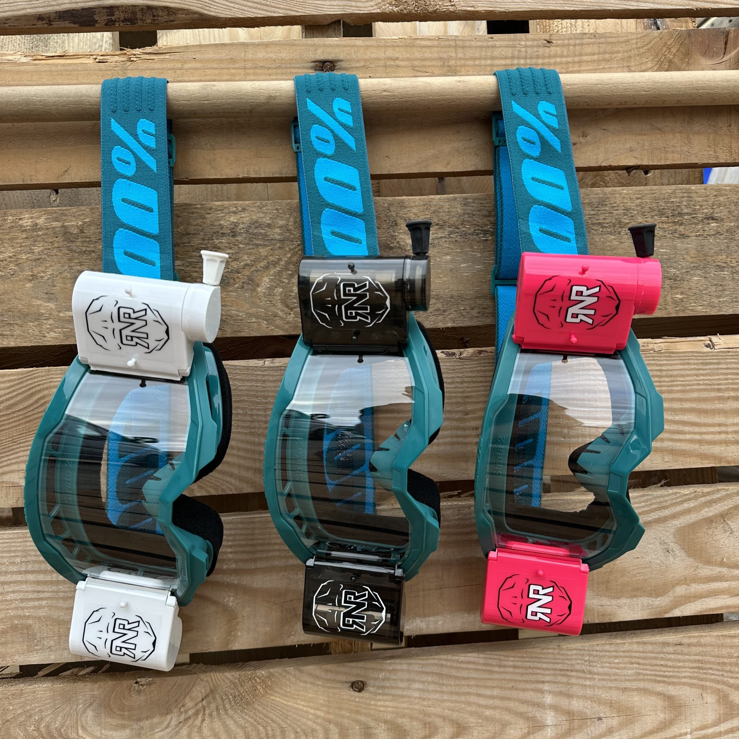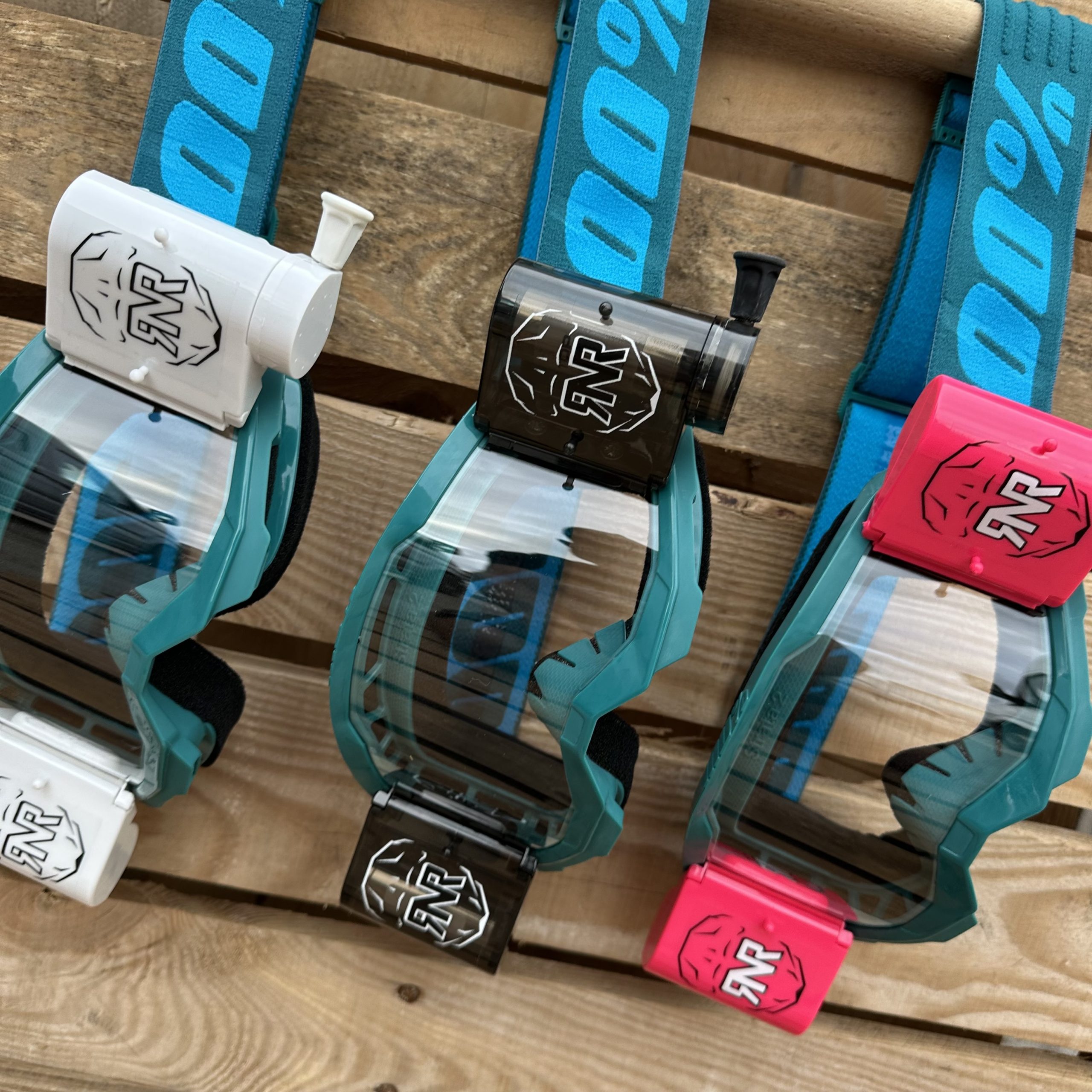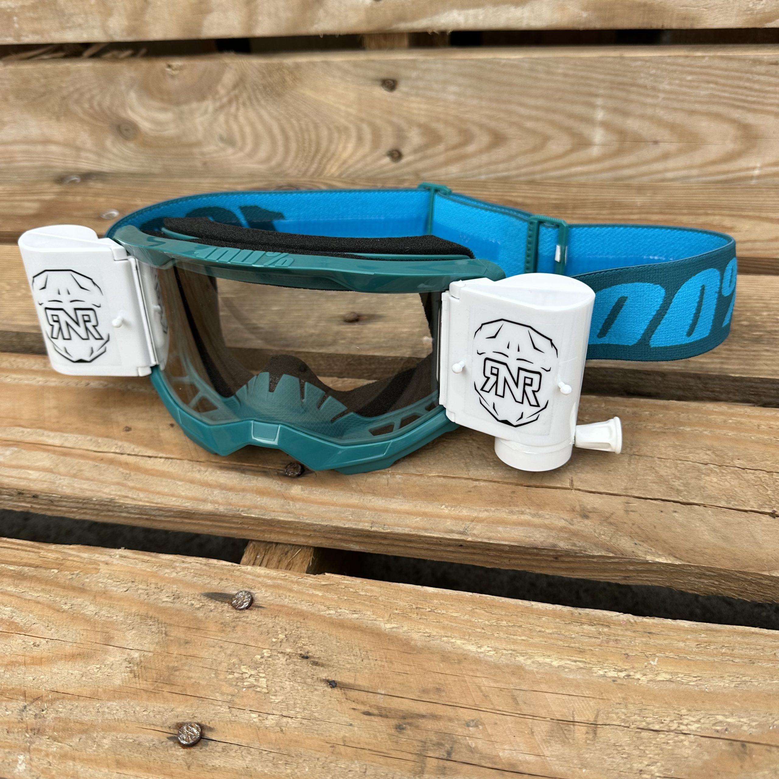 The latest 100% Strata 2 motocross goggles fully loaded with RNR 48mm wvw roll-off system.